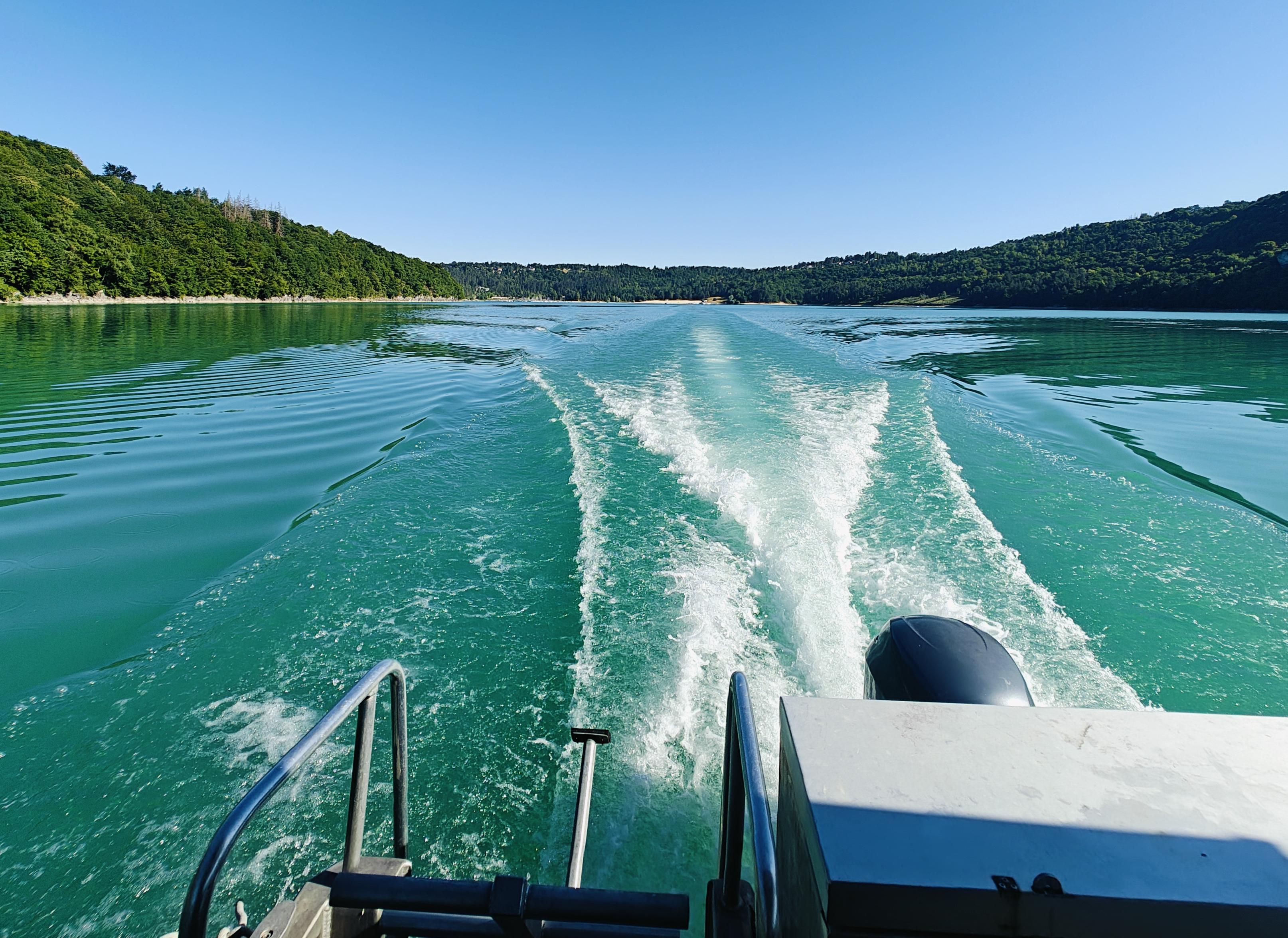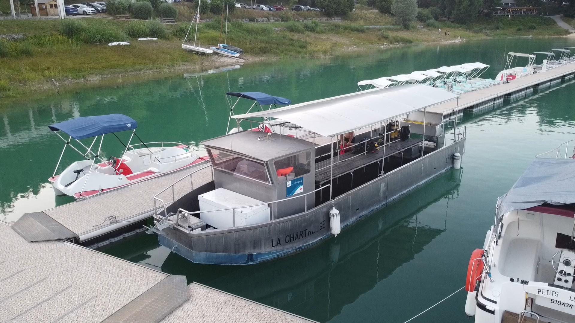 Le bateau du Club, amarré au port de la Mercantine. Il peut accueillir 12 plongeurs. Avec toujours un capitaine en surface, il est équipé de deux échelles, d'un toit pour éviter de cuire et de prendre l'eau et bien sûr d'oxygène et du nécessaire en cas de premiers secours.